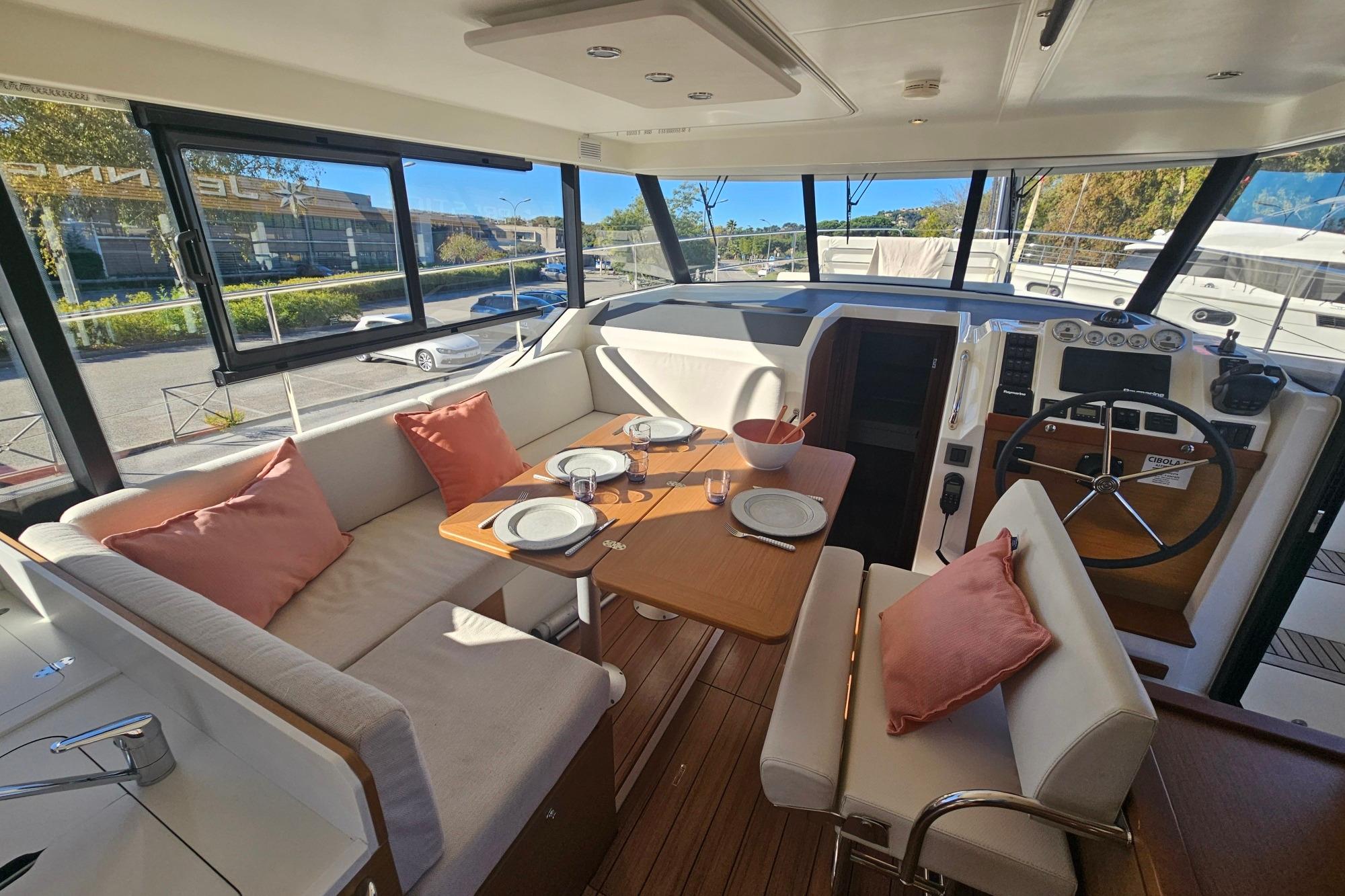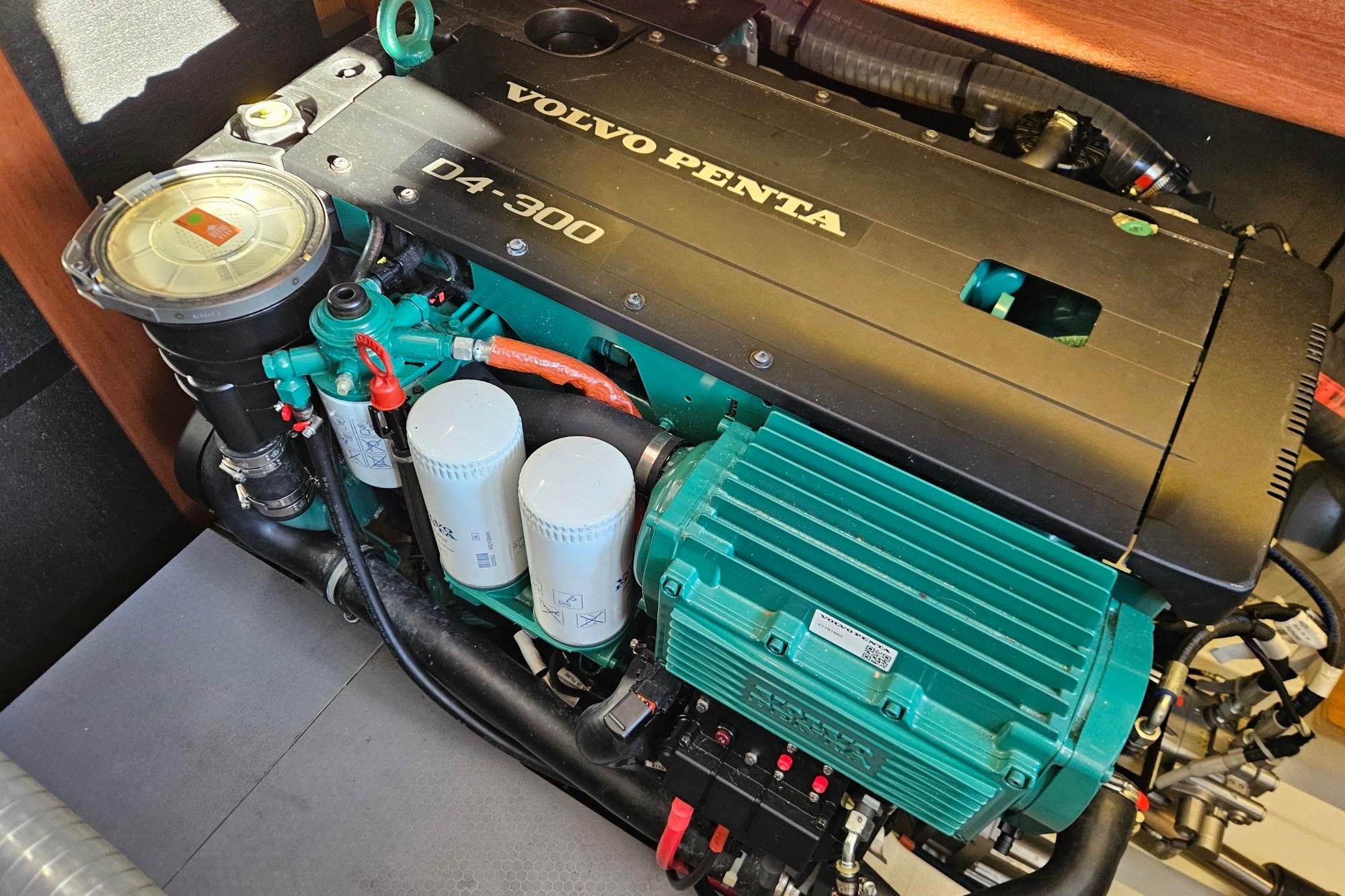 Propulsé par une motorisation Volvo Penta D4 – 2 x 300 cv (643 h) en ligne d’arbre, il garantit une fiabilité exemplaire, une consommation maîtrisée et une excellente tenue de mer. Les propulseurs d’étrave et de poupe assurent des manœuvres simples et sécurisées, idéales pour les ports exigus.