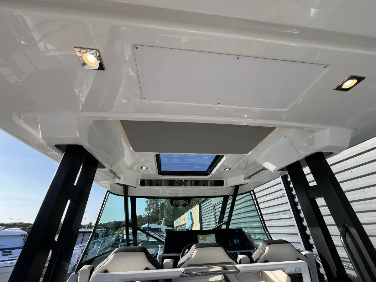 Cette architecture de coque permet une meilleure stabilité au mouillage et une tenue de cap exemplaire, même par mer formée. En configuration standard, le bateau est livré sans T-Top afin de répondre aux contraintes de hauteur de pont, tout en restant compatible selon vos usages et votre environnement.